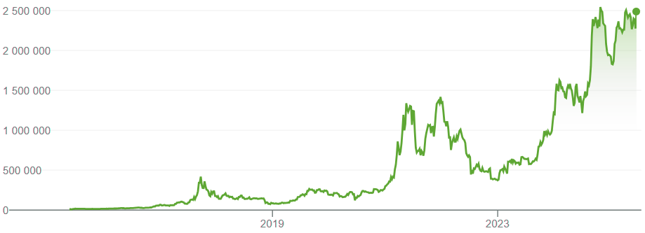 Historický vývoj ceny Bitcoinu vůči české koruně (CZK)